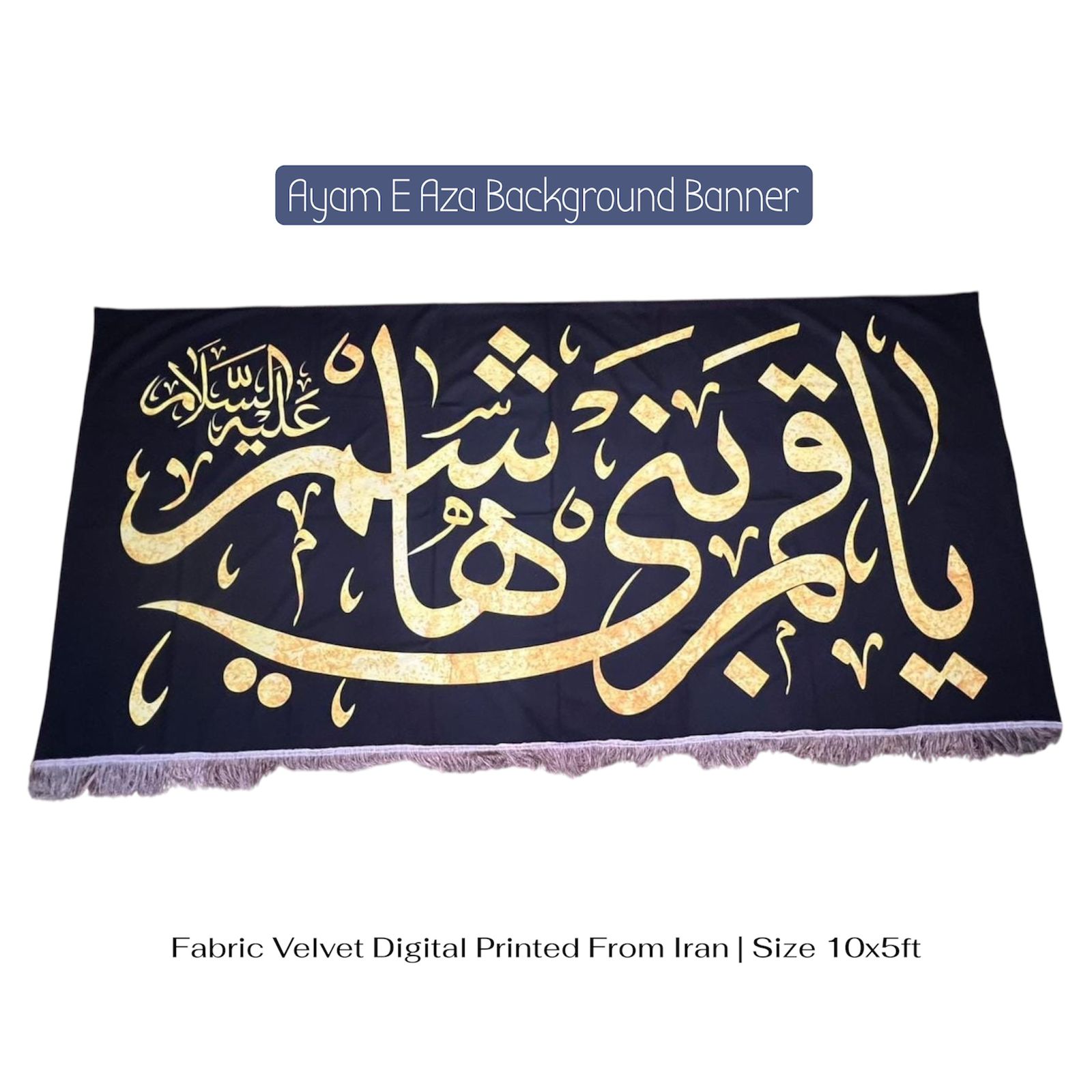 Ayam E Aza Banner Ya Qamar E Bani Hashim AS Background Banner | Fabric Velvet Digital Printed Irani Banner For Use Ayam | Size 10×5ft | Deign By T&M