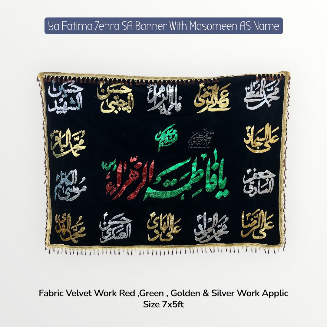 Ayam E Fatima Majlis Background Banners | Asalam O Alaika Ya Fatima Tu Zehra SA With Masomeen AS Names | Fabric Velvet Work Green, Red, Silver & Golden Applic Banner | Size 7x5ft | Deign By T&M