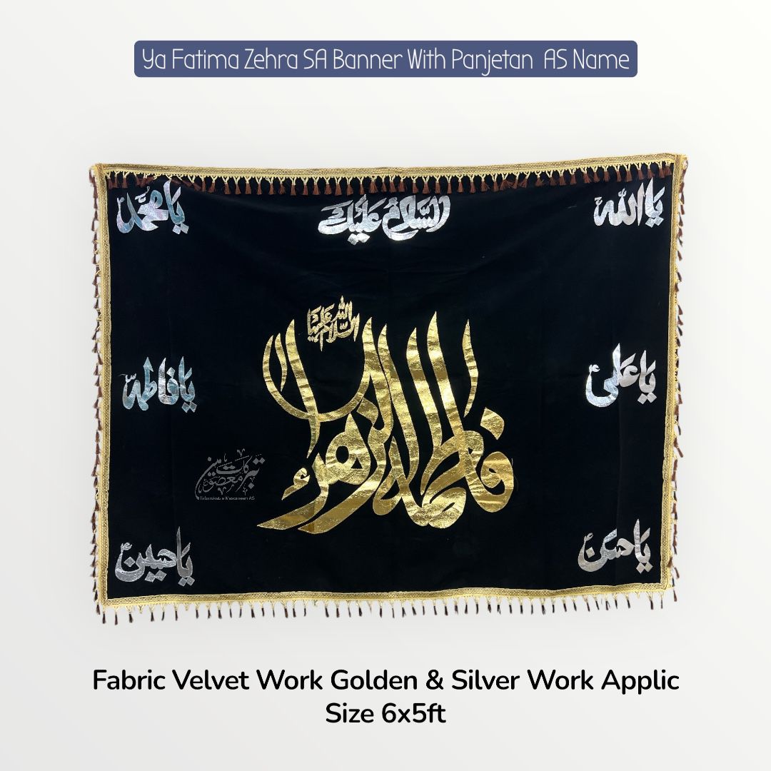 Ayam E Fatima Majlis Background Banners | Asalam O Alaika Ya Fatima Zehra SA With Panjetan AS Names | Fabric Velvet Work Silver & Golden Applic Banner | Size 6x5ft | Deign By T&M