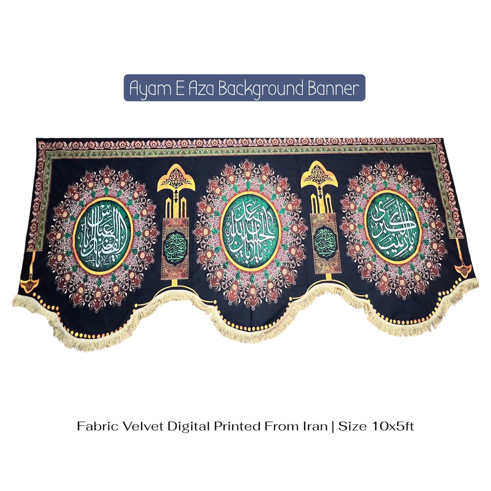 Ayam E Aza Banner Imam Hussain AS Hazrat Abbas AS & Bibi Zainab AS Background Banner | Fabric Velvet Digital Printed Irani Banner For Use Ayam | Size 10×5ft | Deign By T&M