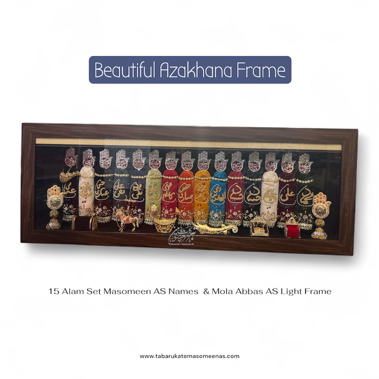 Beautiful Home Azakhana Frame Masomeen AS & Mola Abbas AS Alam High Quality Frame With Light | Patka Work Sitara Moti & Cora Dapka | Ziyarat All Manjus | Size 36x15inch | Design By T&M