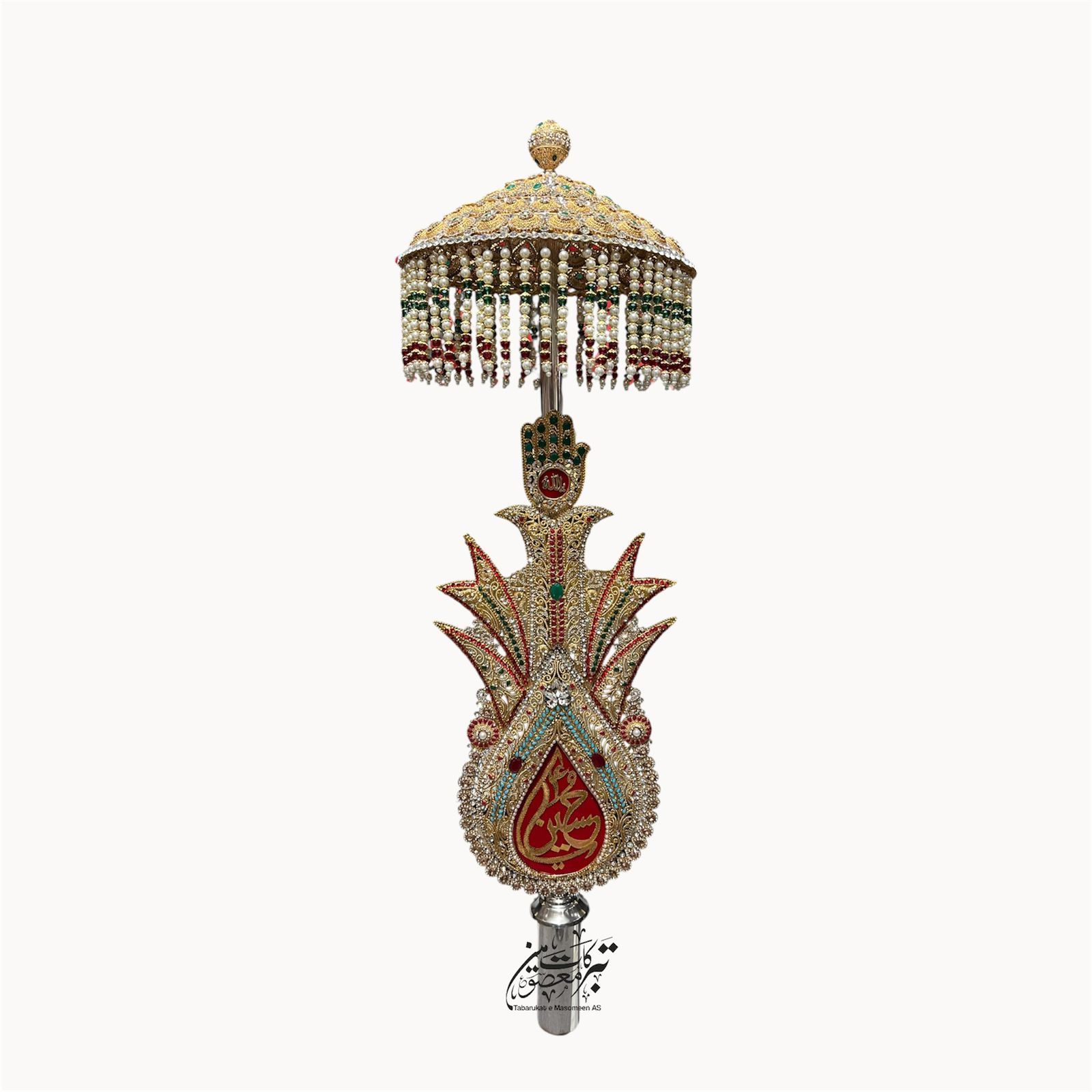 Elegant Manjus work Umbrella Panja featuring the sacred Zulfiqar and Amama design. Decorated with Green , White Pearls base with Red stone, perfect for Muharram Alam setup, Imambargah, and home Azakhana decoration