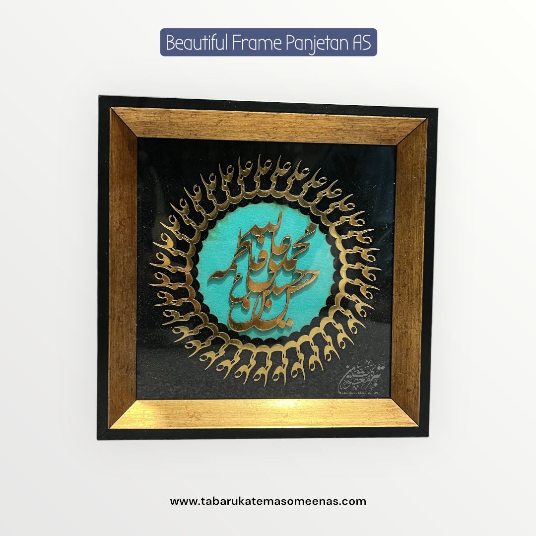 Beautiful Wall Frame Panjetan AS Names High Quality Frame | Material Wood High Quality Calligraphy In Golden Acylic Sheet Frame Background Ferozi & Black | Size 10×10 Inch | Made In Karbala