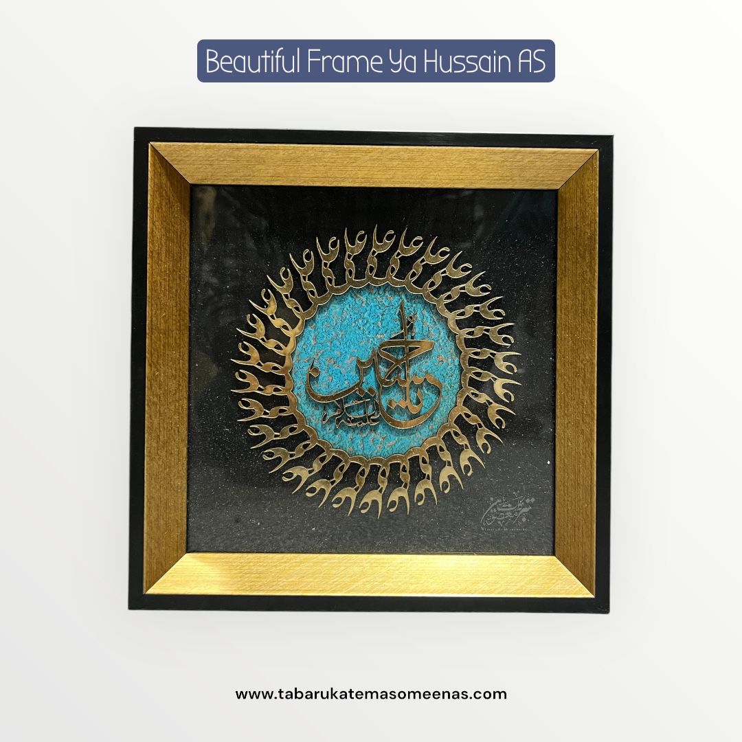 Beautiful Wall Frame Ya Hussain AS High Quality Frame | Material Wood High Quality Calligraphy In Golden Acylic Sheet Frame Background Ferozi & Black | Size 10×10 Inch | Made In Karbala