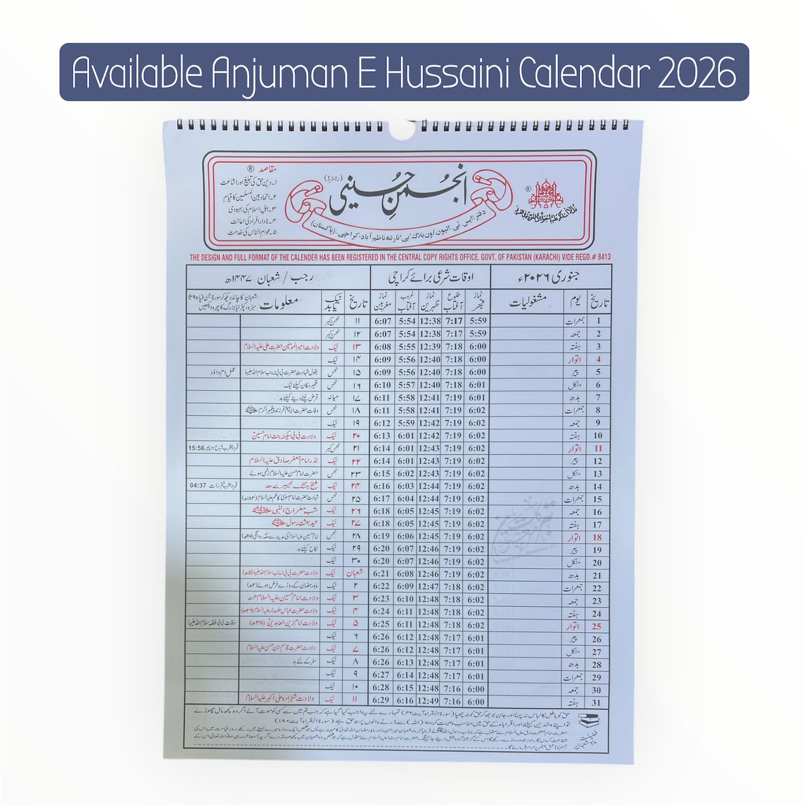 Anjumane Hussaini Calendar 2026 the authentic Calendar for all Islamic Dates Namaz Timing Calendar. For Regular Namaz timing Calendar 2026 is available now.